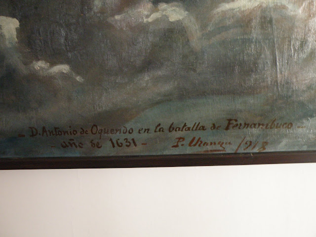 “En la batalla naval, que el almirante general D. Antonio de Oquendo tuvo con la armada de Holanda en Pernambuco en el año 1631  a doce de septiembre, entre otras muchas balas que quedaron en su capitana, de las que el enemigo le disparo, es ésta una, la cual ofreció en hacimiento  de gracias de la victoria a la virgen de Aranzazu como su unica protectora.”