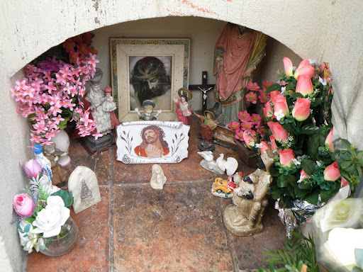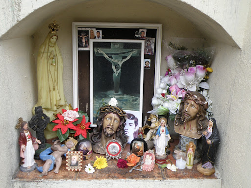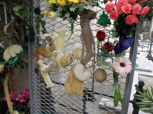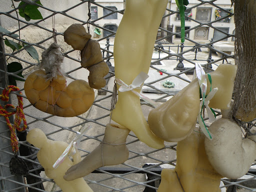 Enfrente de la tumba se encuentra un valla metálica en la que sus devotos le ofrecen tanto ofrendas florales como exvotos de cera.