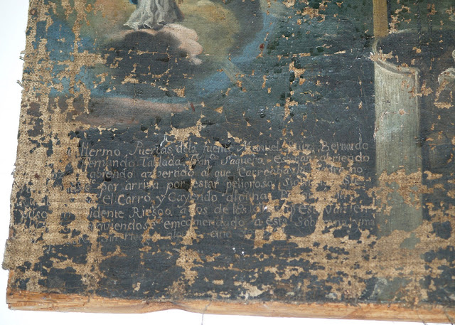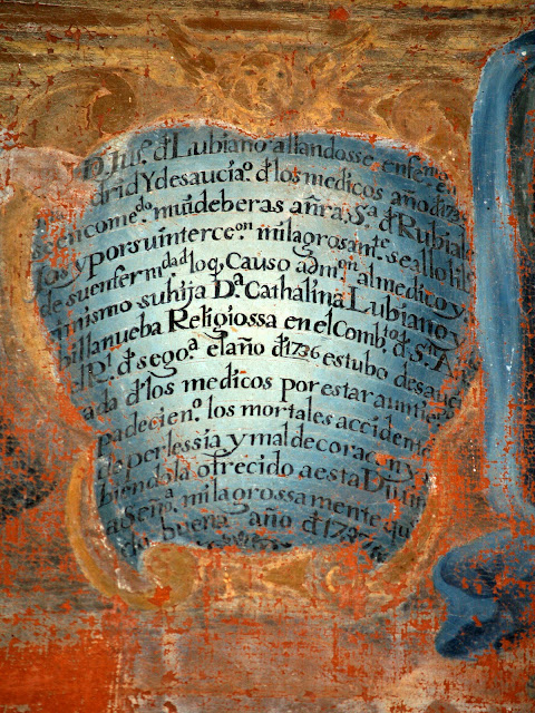 -Lema o inscripción: D. Jus. Lubiano allandose enferma en (…) y desauciada de los medicos año 173(sic) se encomendo mui de beras a nra. Sª de Rubialejo y por su intercesion milagrosamente se allo libre de su enfermedad lo q causo admiración al medico y a si mismo su hija Dª Cathalina Lubiano y billanueva Religiosa en el comto de (…) el R. de sego el año d 1736 estubo desauciada de los medicos por estar (…) padeciendo los mortales accidentes de perlessia y mal de corazón y abiendola ofrecido a esta Divina Señora milagrosamente queo buena año de 1737.