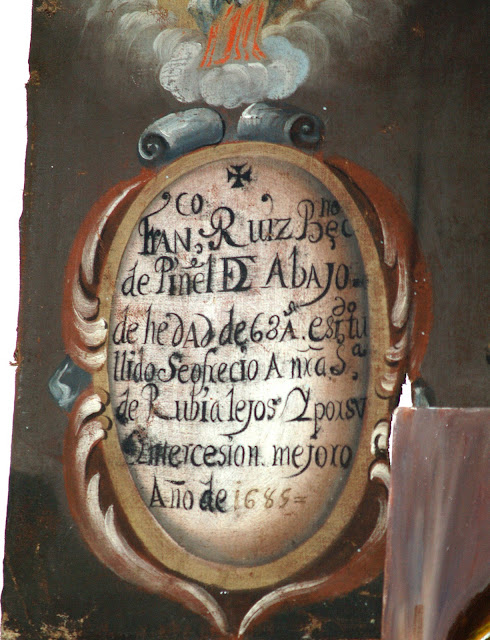 -Lema o inscripción: Francisco Ruiz becino de Pinel De Abajo de hedad de 63 a estando tullido se ofrecio a Nuestra Sª de Rubialejos y por su intercesión mejoro año de 1689.