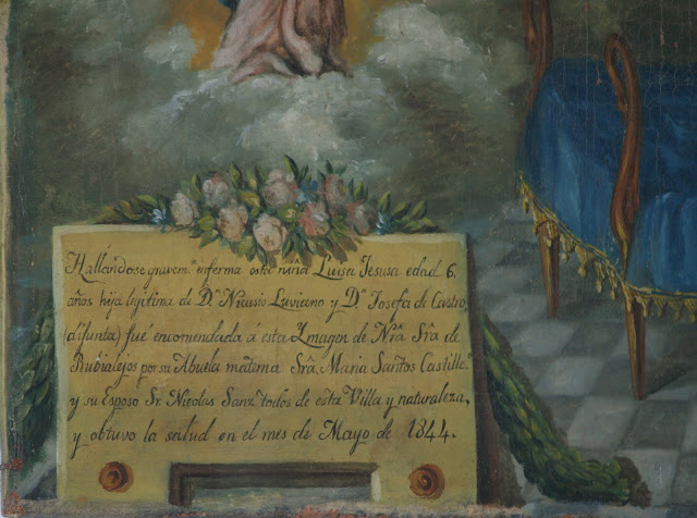 -Lema o inscripción: Hallandose gravemente enferma esta niña Luisa Jesusa edad 6 años hija legitima de D. Nicasio Luviano y Dª Josefa de Castro (difunta) fue encomendada a esta Imagen de Nuestra Señora de Rubialejos por su Abuela materna Sra Maria Santos Castilla y su esposo Sr. Nicolás Sanz todos de esta villa y naturaleza, y obtuvo la salud en el mes de mayo de 1844.