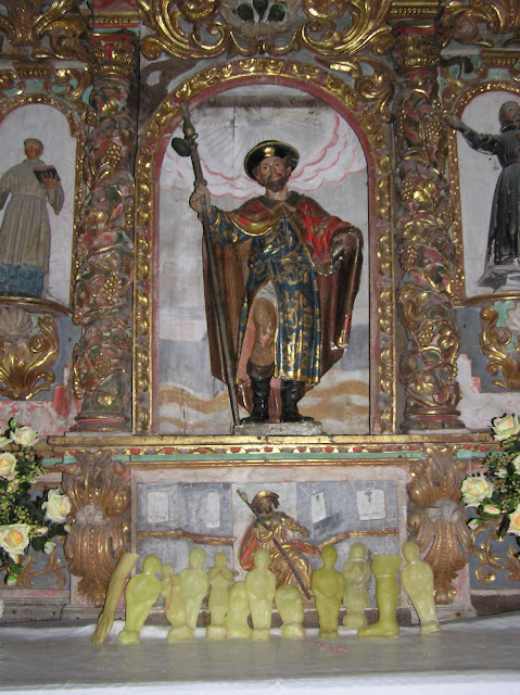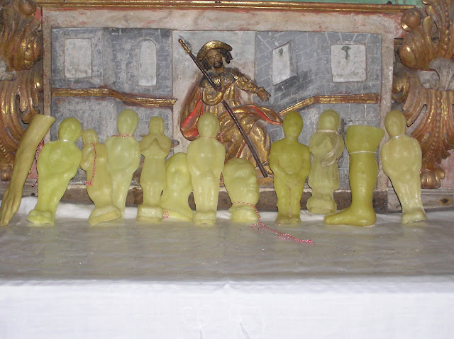En un altar dedicado a San Roque en el Monasterio de San Esteban de Ribas de Sil, Galicia, se conservan varios exvotos de cera de figuras humanas, brazos, cabezas y piernas.
