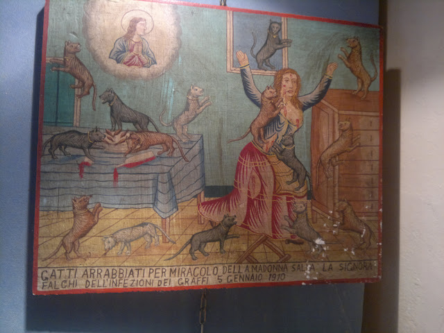-Lema o inscripción: Gatti arrabbiati per miracolo della Madonna salva la signora Falchi dell’infezioni dei graffi. 5 Gennaio 1910.