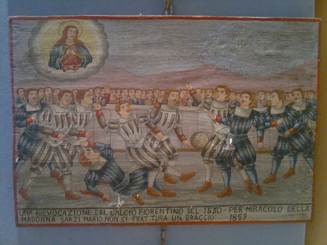 -Otros datos: Vemos a un grupo de hombres jugando al calcio fiorentino, una forma primitiva del fútbol originaria del siglo XVI en Italia. Uno de los jugadores agradece no haberse roto el brazo en una caida.
