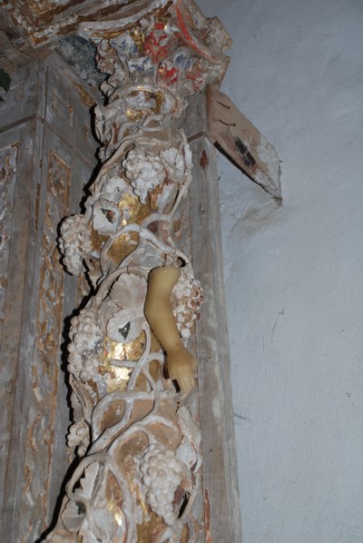 Exvoto de cera sobre una columna del retablo. Ermita de san Isidro de Quintanilla de Urz..jpg