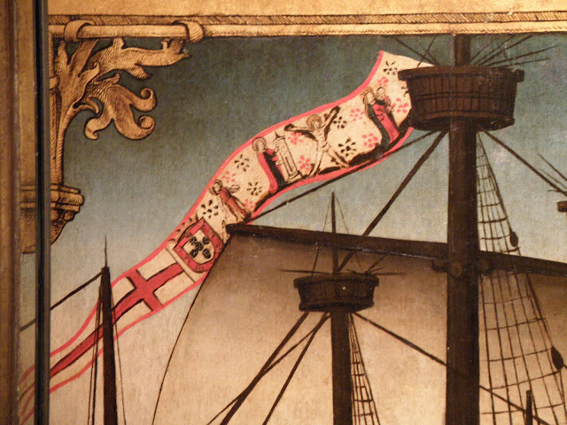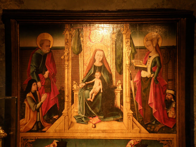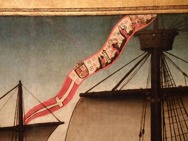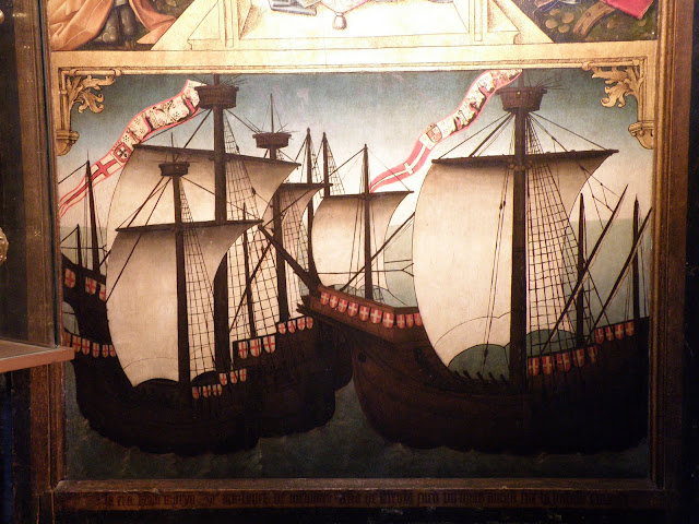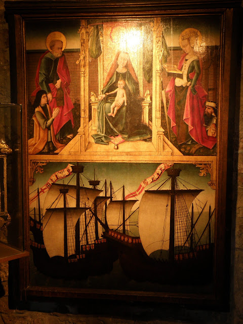 Iglesia parroquial de San Pedro, Zumaia. En una pequeña capilla lateral se encuentra una importante pintura sobre tabla que fue donada por Juan Martínez de Mendaro, zumaiano que dirigía la armada castellana en la batalla de Gibraltar. En la mitad inferior se recoge una escena de dicha batalla, una de las primeras representaciones de este tipo de arte. La mitad superior está presidida por la Virgen con el niño sentada en un trono y flanqueada por San Pedro, que protege al donante, y Santa Catalina de Alejandría en el otro lado. (fuente: http://zumaia.net/turismo/lugares-de-interes/arte/parroquia-de-san-pedro-1)
