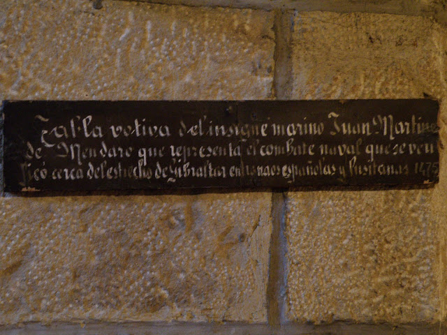 -Lema o inscripción: A un lado de la tabla votiva se recoge el siguiente texto: “tabla votiva del insigne marino Juan Martinez de Mendaro que representa el combate naval que se verifico cerca del estrecho de Gibraltar entre naves españolas y lusitanas (1475)”