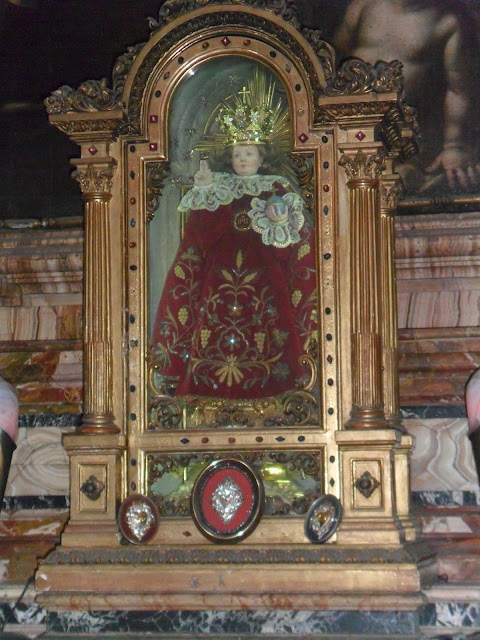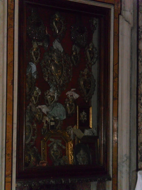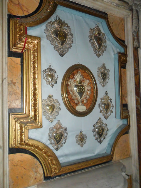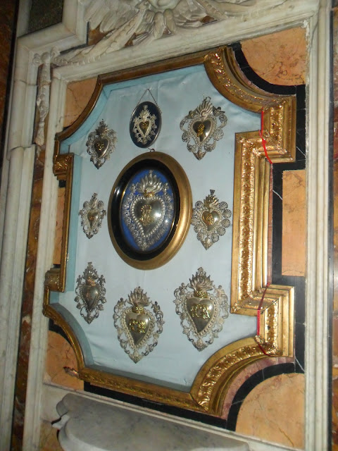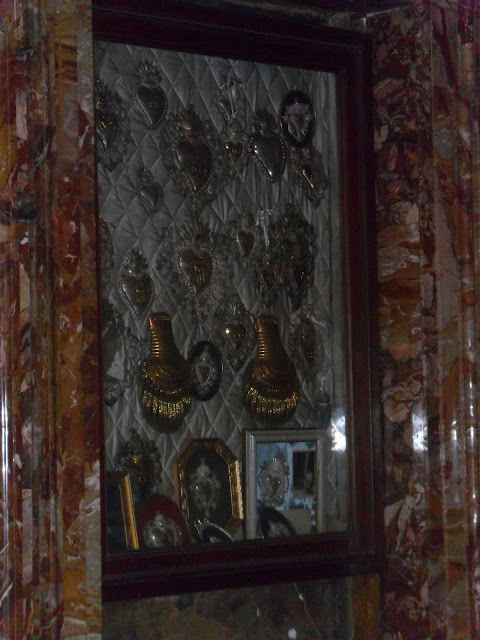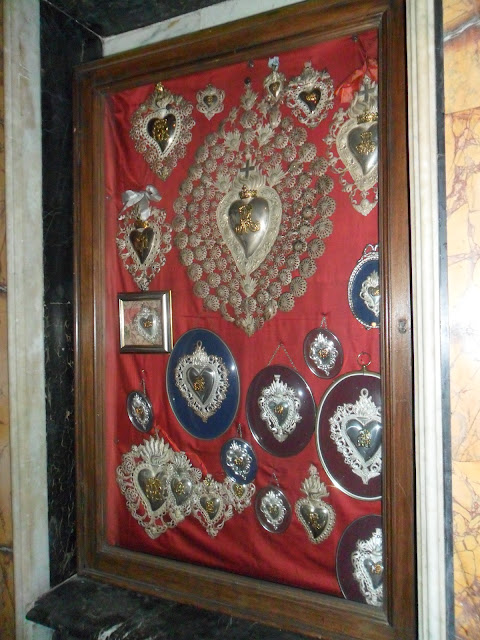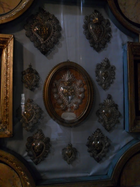En las capillas, y dispuestos en el frontal de la iglesia, encontramos docenas de exvotos bañados en plata (sobre todo sagrados corazones) agrupados en marcos.